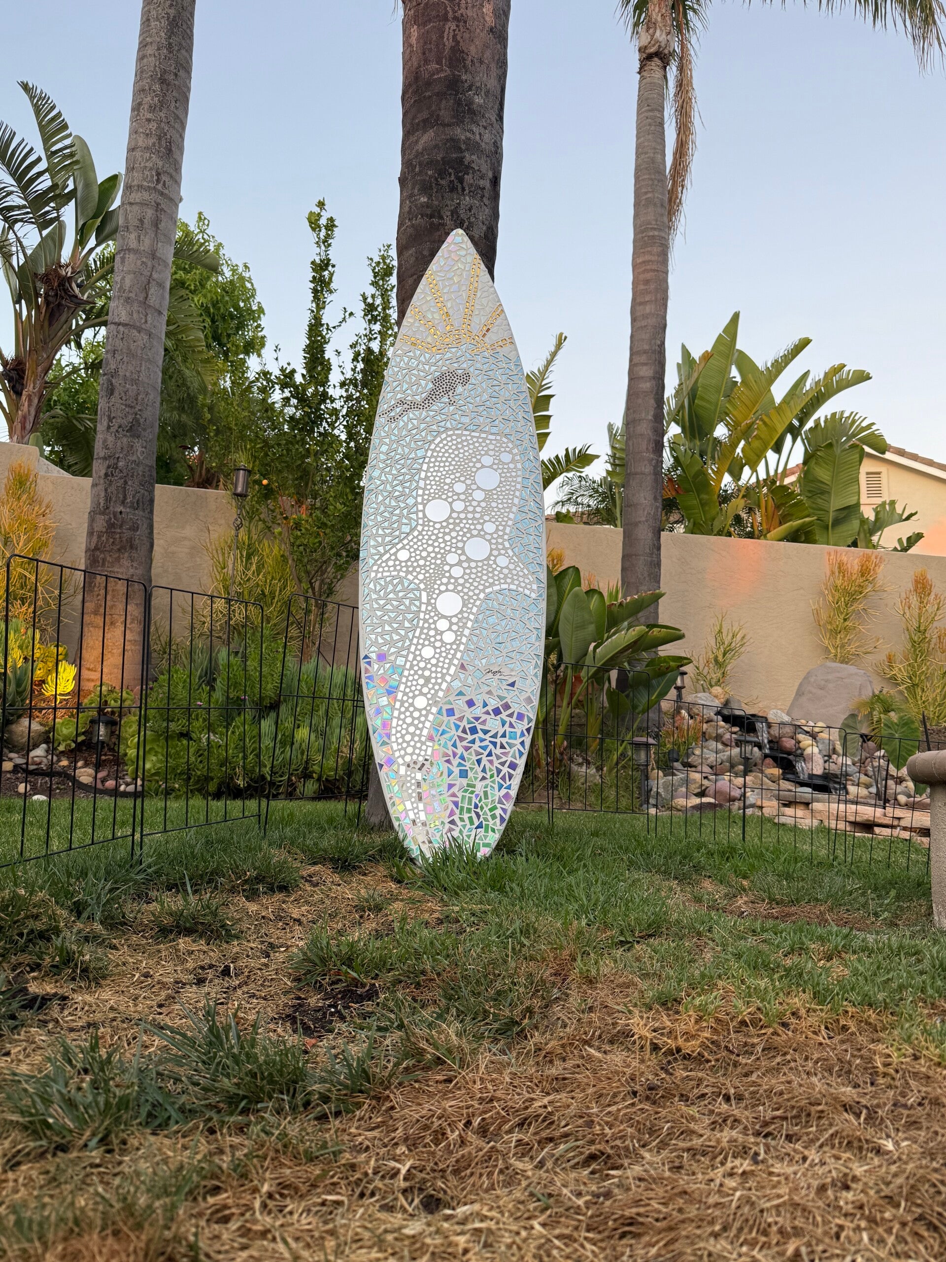 All surfboard products are hand made using used surfboards. Sometimes the actual board is already sold but these can be custome made to order so please allow 3 weeks to make them plus shipping time. Not every board will be the exact same as they're hand made. These are made on real surfboards ranging from 4'10 to 6'4". These are great conversations pieces for businesses, restraints, out by the pool or anyone's living room. This board is 5'4"