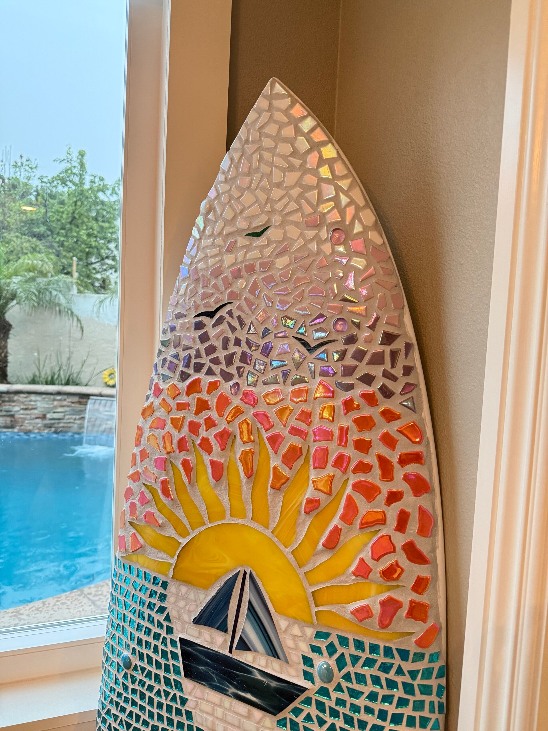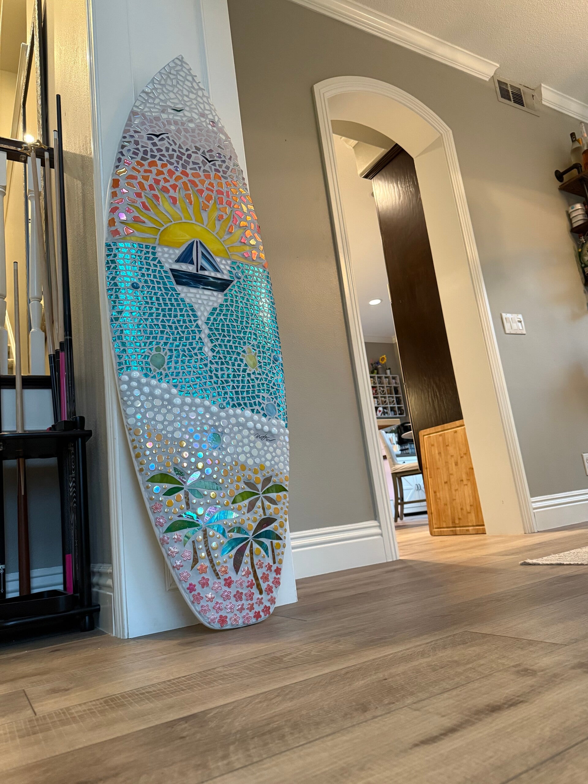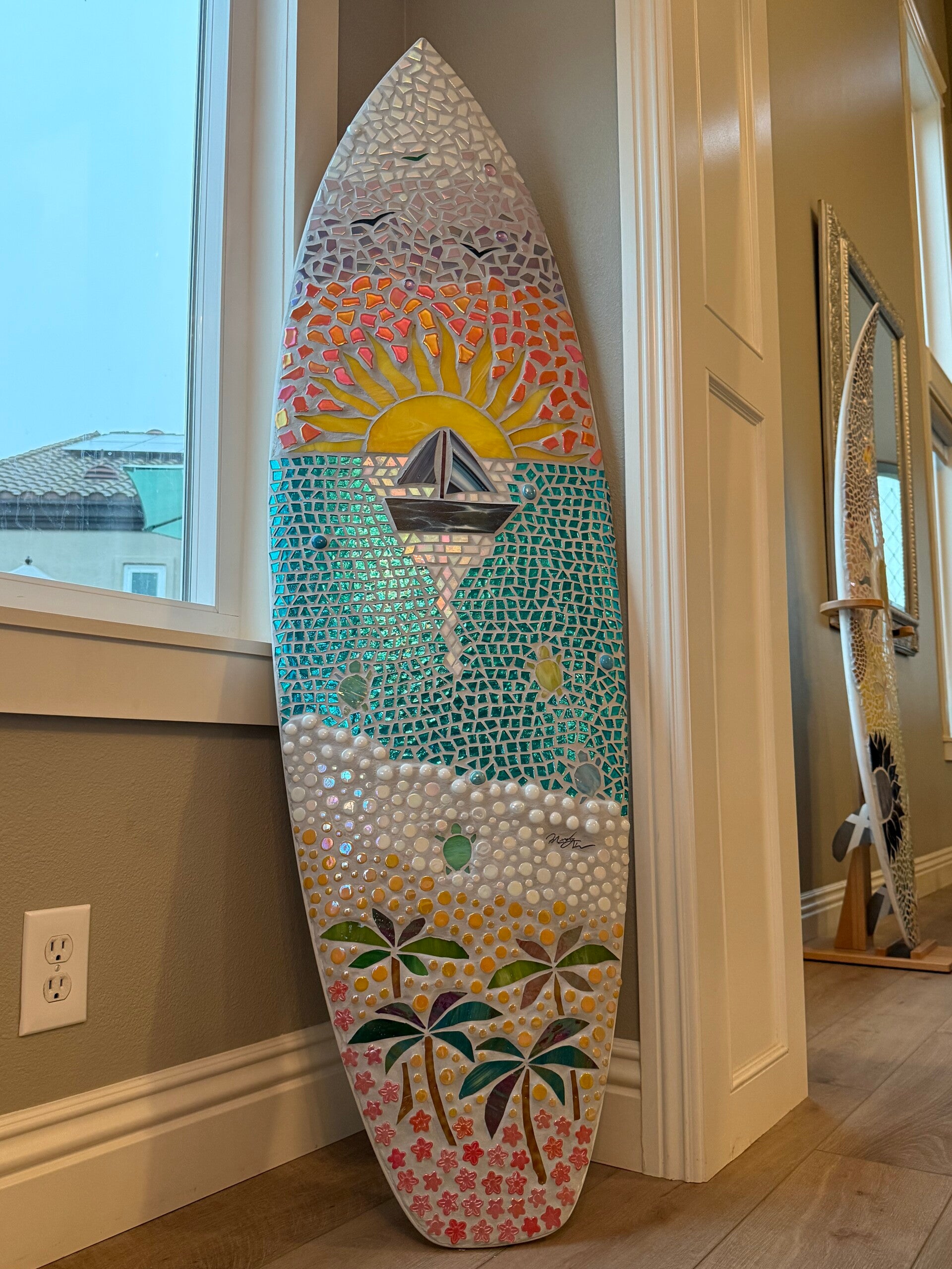 This is a sailors sunset board! This piece is sold but the design is available. This means you can change the color of the sail boat if you'd like. You'll need to allow for extra time for me to order the color you'd like but once I have all the materials i should have it made in no more then 3 weeks. The colors of the palm trees will vary a bit as well. Each board is one of a kind so no two will be the exact same. These boards are all made from used surfboards and the sizes very from 4'8-6'4" depending on what I can get my hands on and what will fit your space
