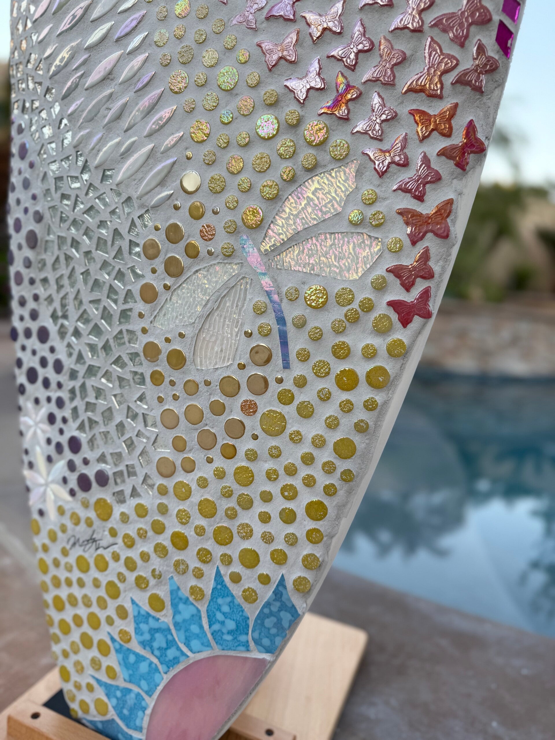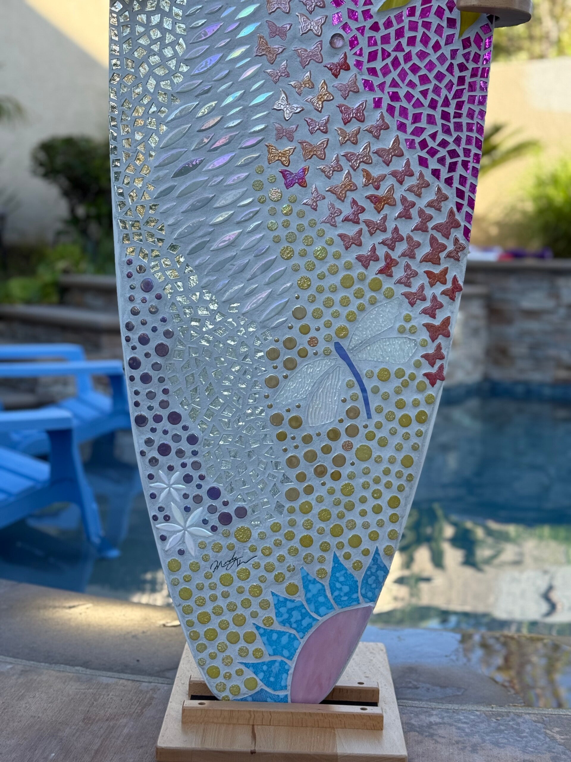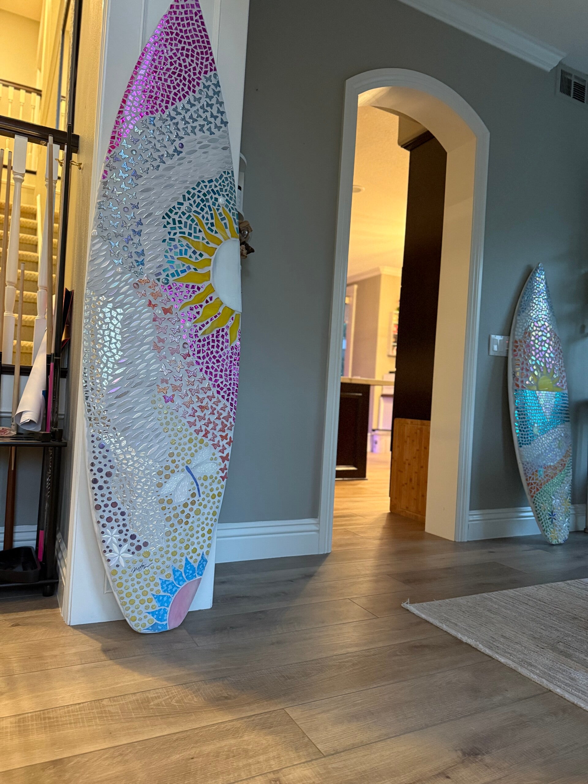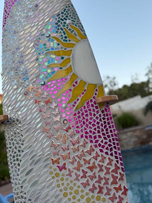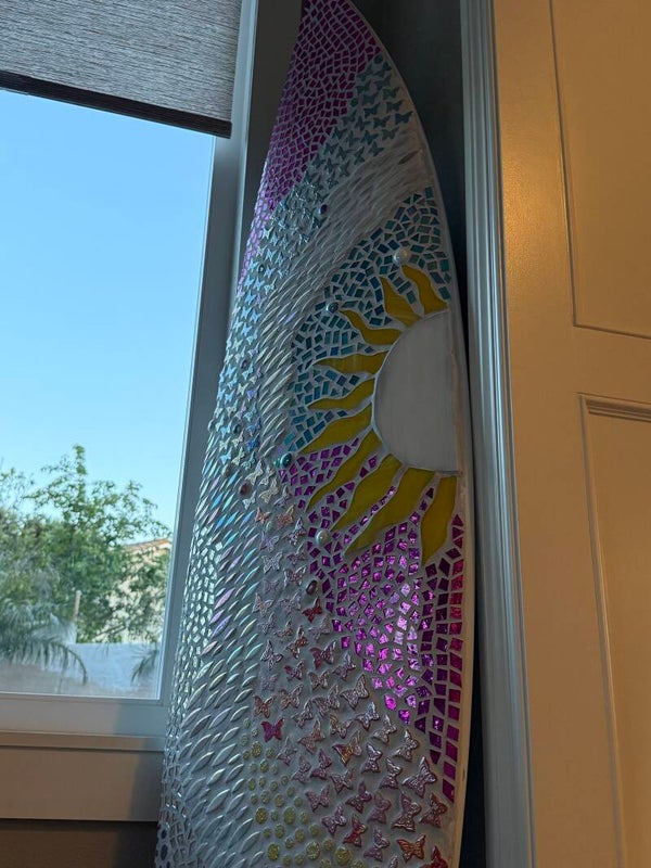 This is a very fun board this one is available but I can always make it custom as well with different colors and with or with out the dragon flys. The some colors will most likely vary some between boards and the design will not be an exact match as I don't have any kind of template made for these. I use used surfboards in great condition and the size rages from 4'8"-6'4" depending on what's available and what fits your space best.