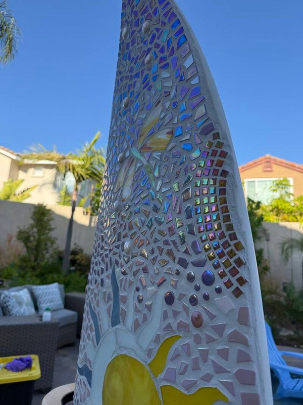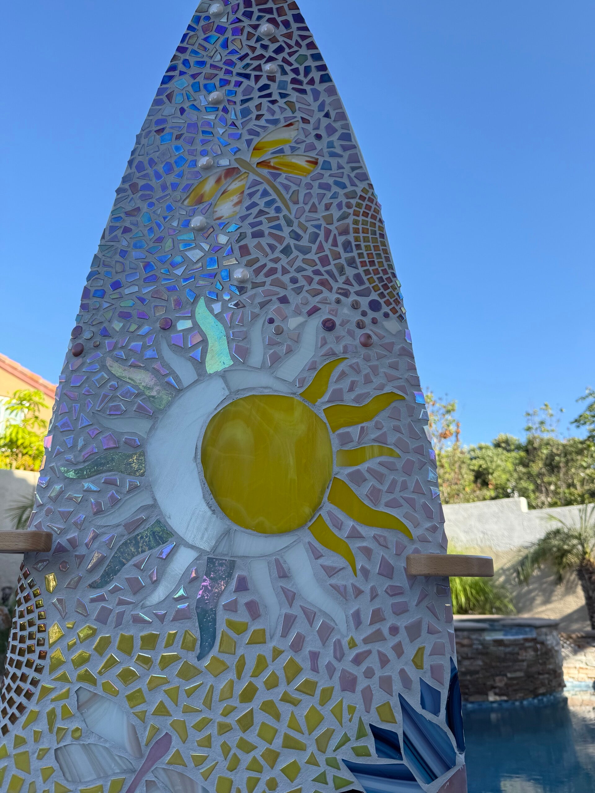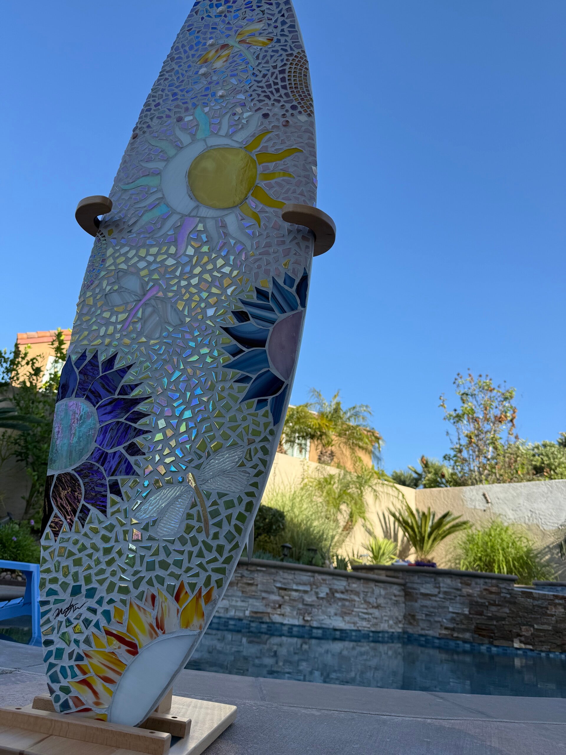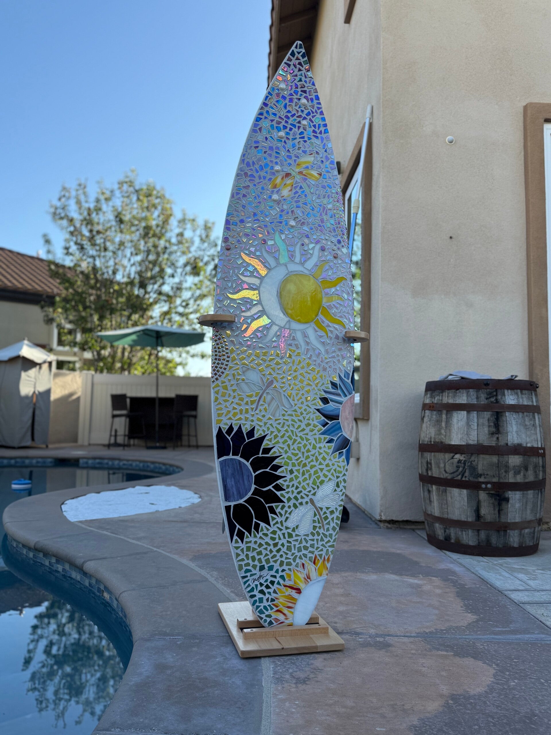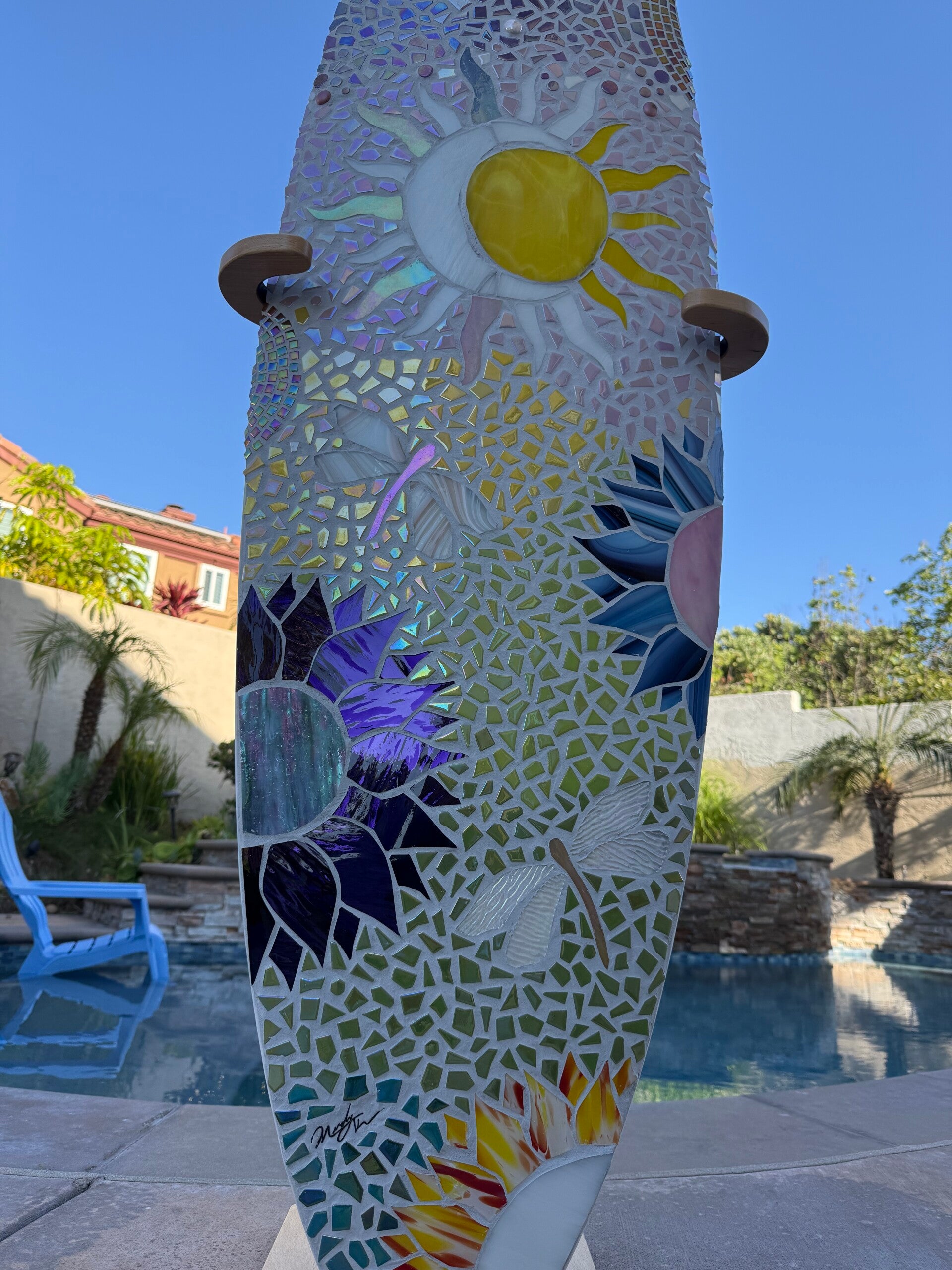 This board is sold but the design is available, with the sun and moon, flowers, dragon flys and even the Big Dipper this board has it all. Definitely expect 3 weeks for me to finish the board and then shipping. These are made using used surfboards in great condition and range from 4'8"-6'4" depending on what's available I have available to me and what works with your space best. Just remember these are all hand made and no two will be the exact same.